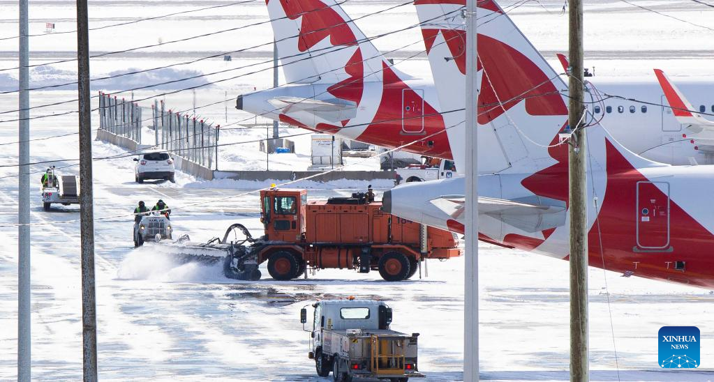 A runway sweeper clears snow at Toronto Pearson International Airport in Mississauga, the Greater Toronto Area, Canada, on Feb. 18, 2022. The city of Toronto and surrounding areas got a heavy snowfall from Thursday afternoon to Friday morning. (Photo by Zou Zheng/Xinhua)