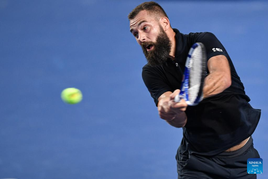Benoit Paire of France hits a return during the men's singles first round match against Daniil Medvedev of Russia at the 2022 ATP Mexican Open tennis tournament in Acapulco, Mexico, Feb. 22, 2022. (Xinhua/Xin Yuewei)