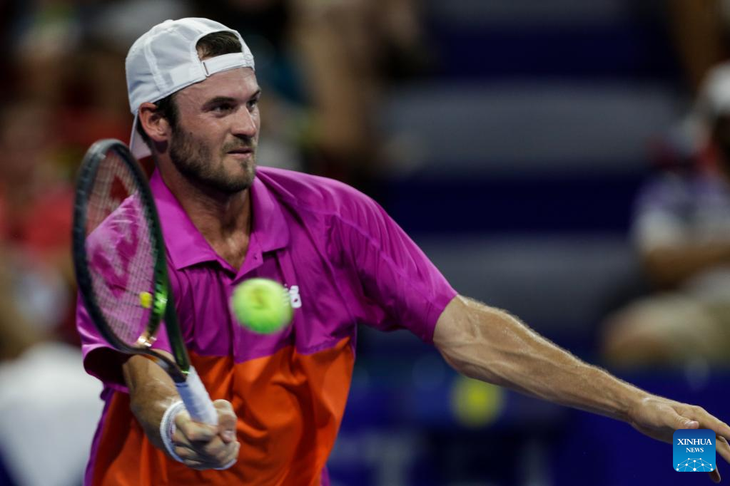 Denis Kudla of the United States hits a return during the men's singles first round match against Rafael Nadal of Spain at the 2022 ATP Mexican Open tennis tournament in Acapulco, Mexico, Feb. 22, 2022. (Xinhua/Xin Yuewei)