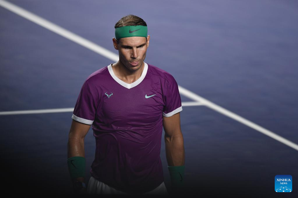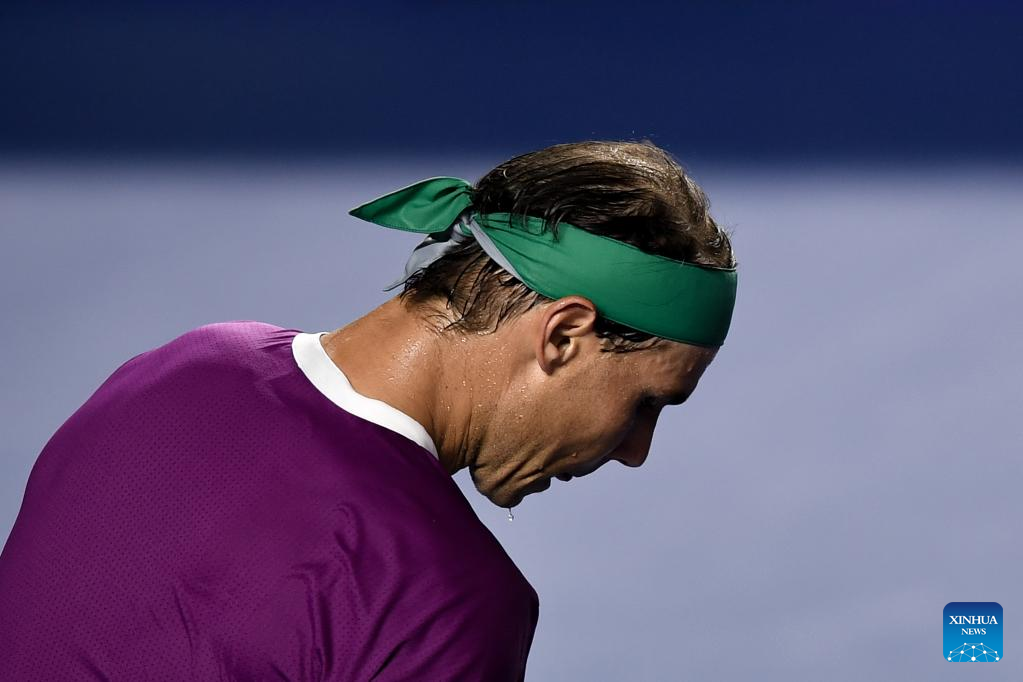 Rafael Nadal of Spain reacts during the men's singles first round match against Denis Kudla of the United States at the 2022 ATP Mexican Open tennis tournament in Acapulco, Mexico, Feb. 22, 2022. (Xinhua/Xin Yuewei)
