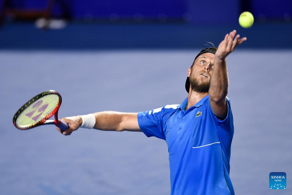 Denis Kudla of the United States serves during the men's singles first round match against Rafael Nadal of Spain at the 2022 ATP Mexican Open tennis tournament in Acapulco, Mexico, Feb. 22, 2022. (Xinhua/Xin Yuewei)
