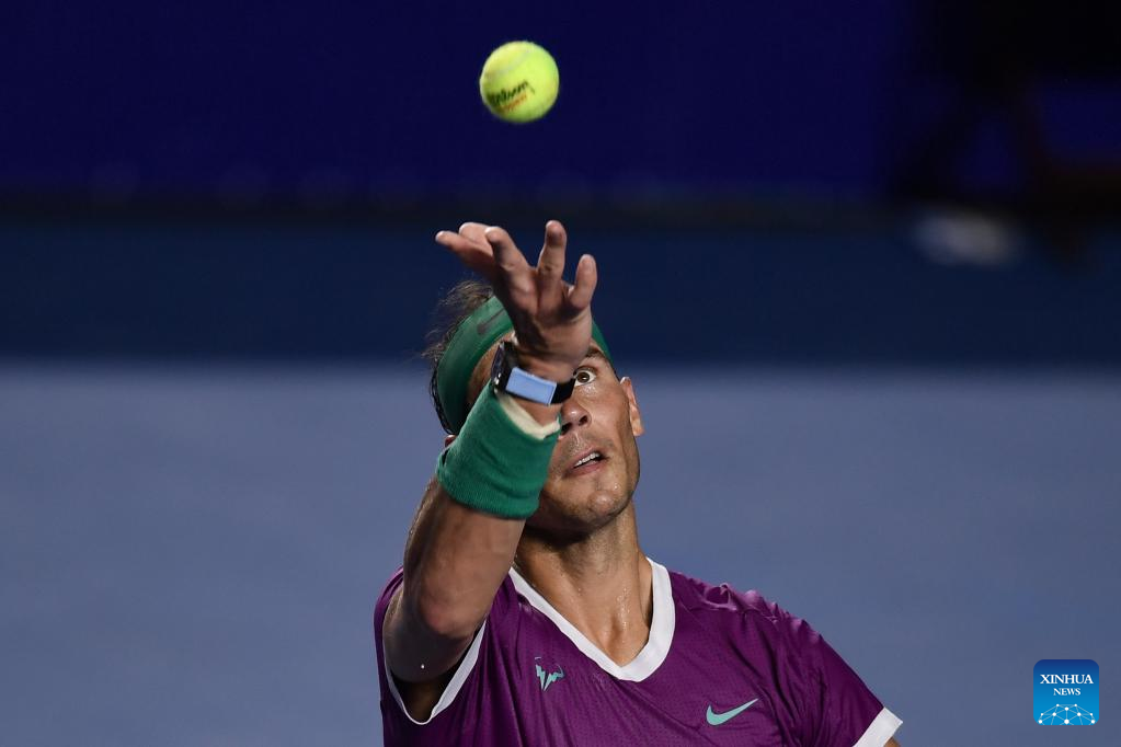 Rafael Nadal of Spain serves during the men's singles first round match against Denis Kudla of the United States at the 2022 ATP Mexican Open tennis tournament in Acapulco, Mexico, Feb. 22, 2022. (Xinhua/Xin Yuewei)