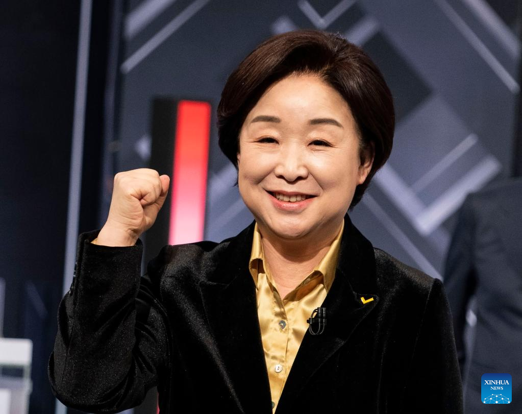 South Korean presidential candidate Sim Sang-jeung of the Justice Party attends a televised debate for the upcoming March 9 presidential election in Seoul, South Korea, March 2, 2022. (Photo by James Lee/Xinhua)