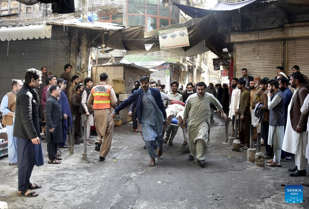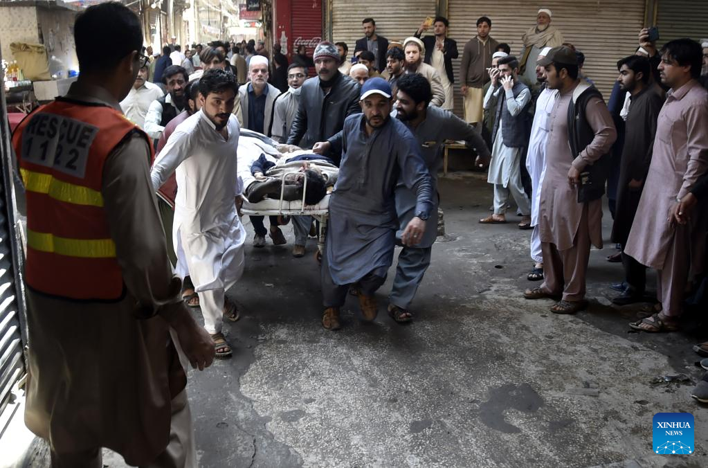 People transfer a victim to a hospital following a blast in Peshawar, Pakistan, on March 4, 2022. A powerful blast hit a mosque in Pakistan's northwestern city of Peshawar in Khyber Pakhtunkhwa province on Friday, leaving at least 30 people dead while wounding over 50 others, police and hospital officials said. (Str/Xinhua)