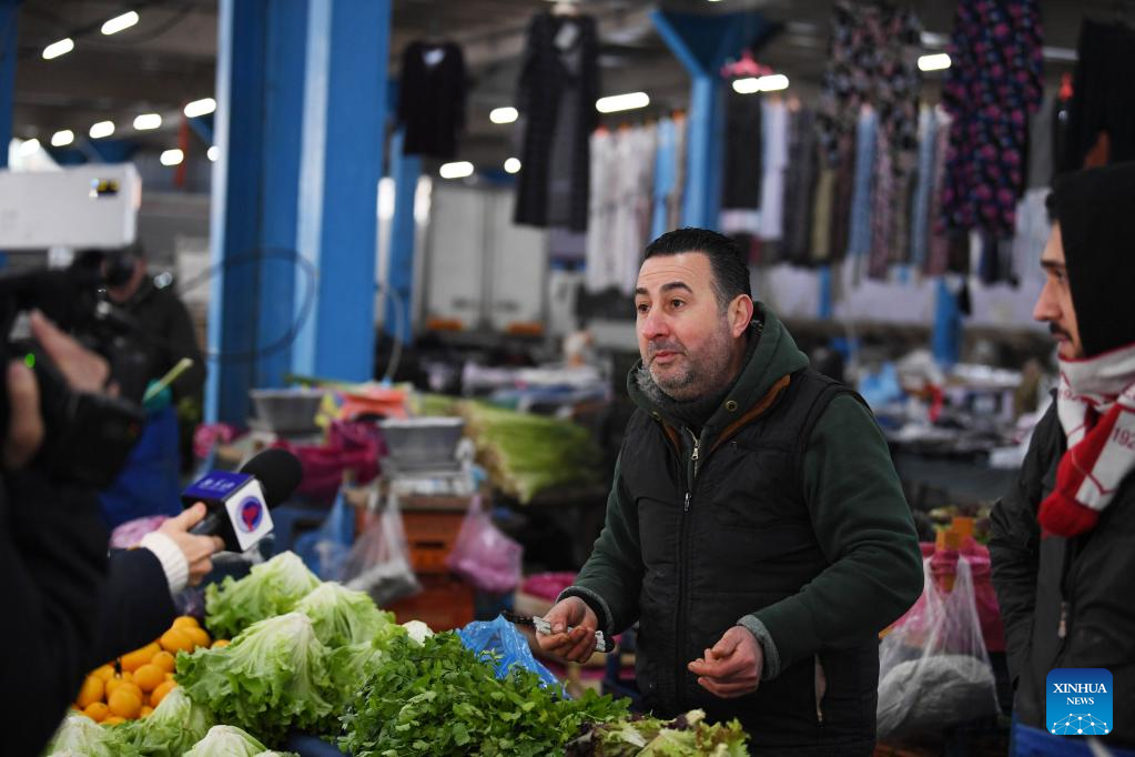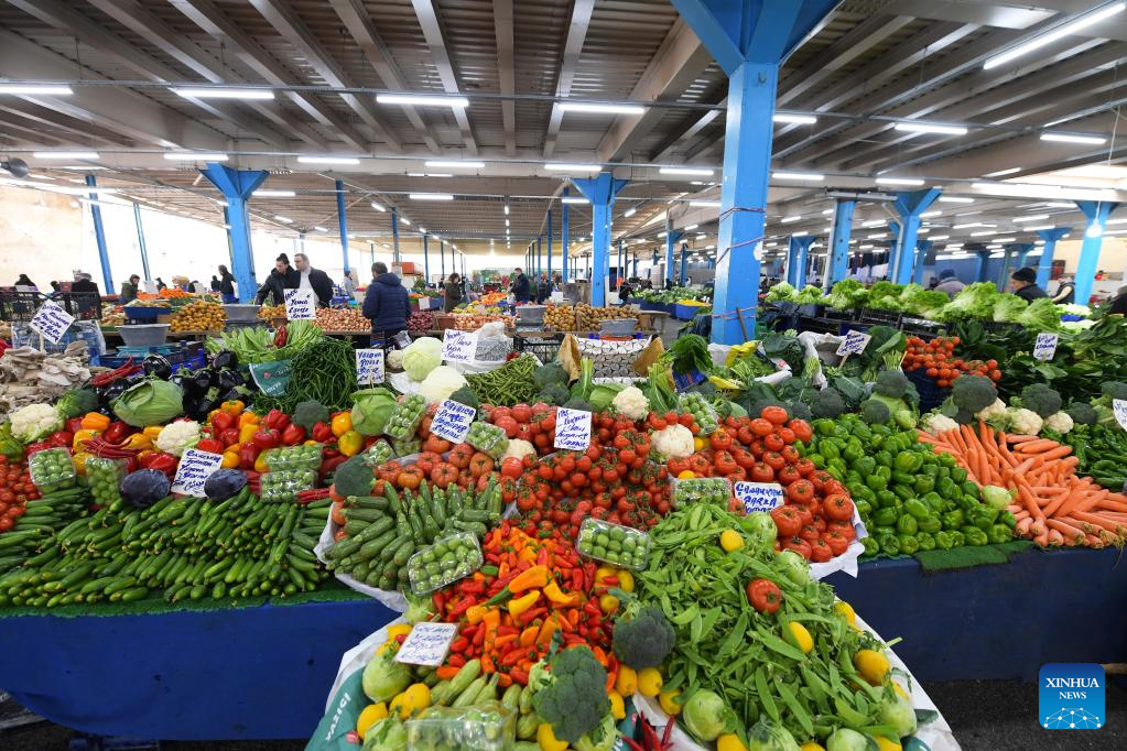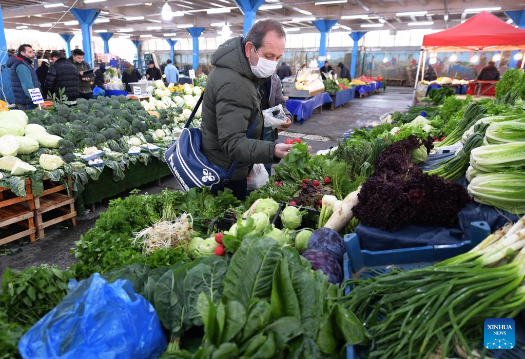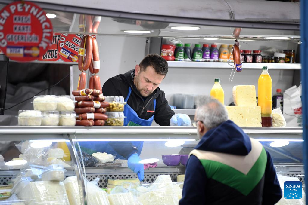 A vendor works at a market in Istanbul, Turkey, March 3, 2022. (Xinhua/Shadati)