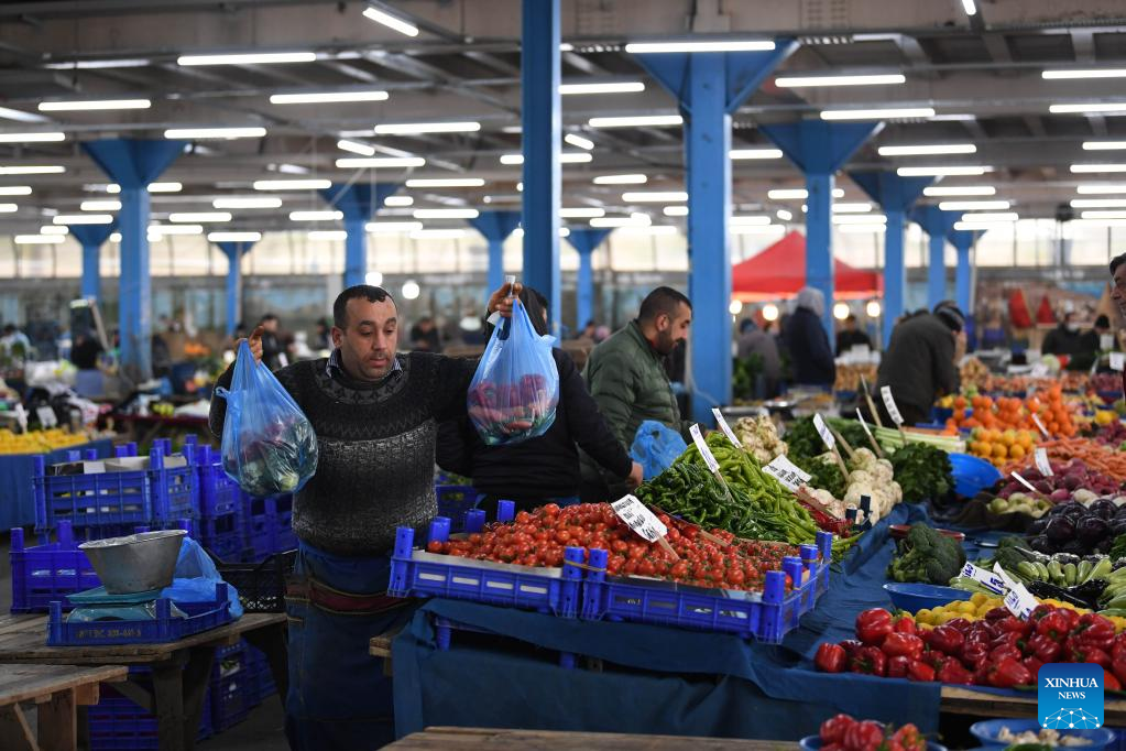 A resident selects vegetables at a market in Istanbul, Turkey, March 3, 2022. (Xinhua/Shadati)