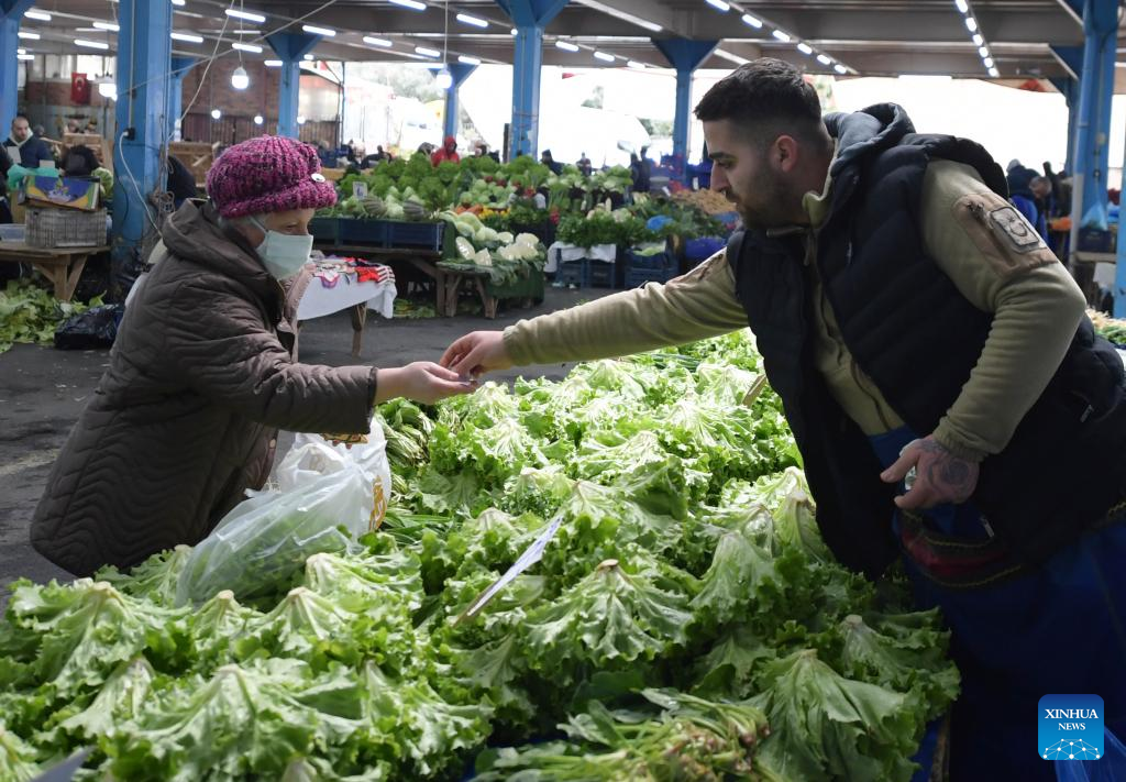 A resident buys vegetables from a vendor at a market in Istanbul, Turkey, March 3, 2022. (Xinhua/Shadati)