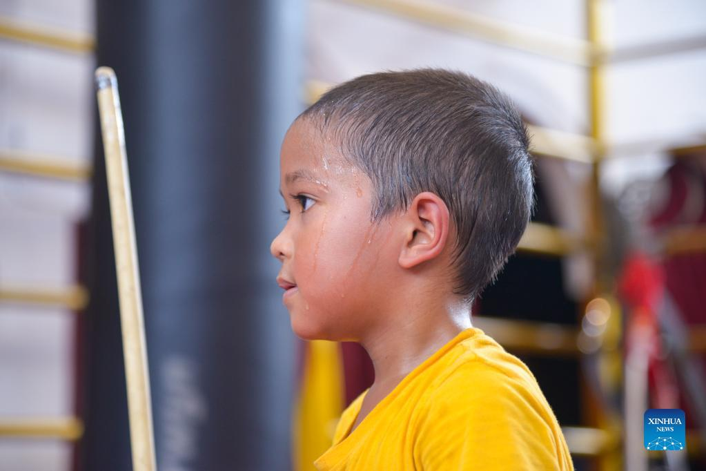 A child sweats while practicing Chinese martial arts at Harmony Wushu Indonesia in Bogor, Indonesia, March 5, 2022. Harmony Wushu Indonesia is a Chinese martial arts hall with a history of 25 years in Bogor, Indonesia. Founded by an Indonesian, Harmony Wushu Indonesia attracts children of different ages around the city to come here and to practice martial arts, keep fit and cultivate interest. (Xinhua/Xu Qin)