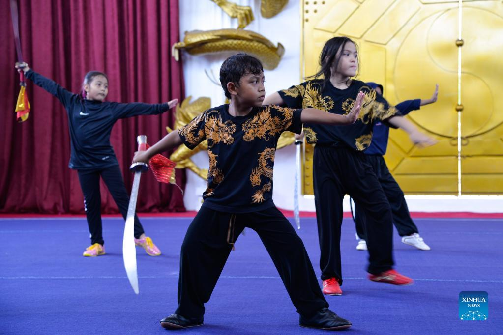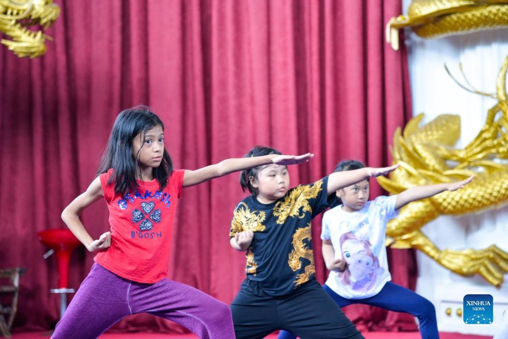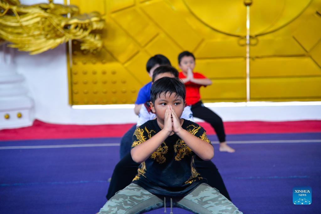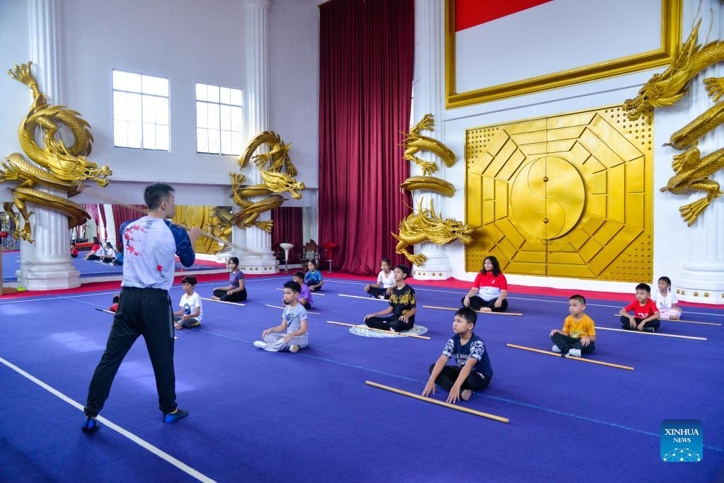 Children practice Chinese martial arts at Harmony Wushu Indonesia in Bogor, Indonesia, March 5, 2022. Harmony Wushu Indonesia is a Chinese martial arts hall with a history of 25 years in Bogor, Indonesia. Founded by an Indonesian, Harmony Wushu Indonesia attracts children of different ages around the city to come here and to practice martial arts, keep fit and cultivate interest. (Xinhua/Xu Qin)