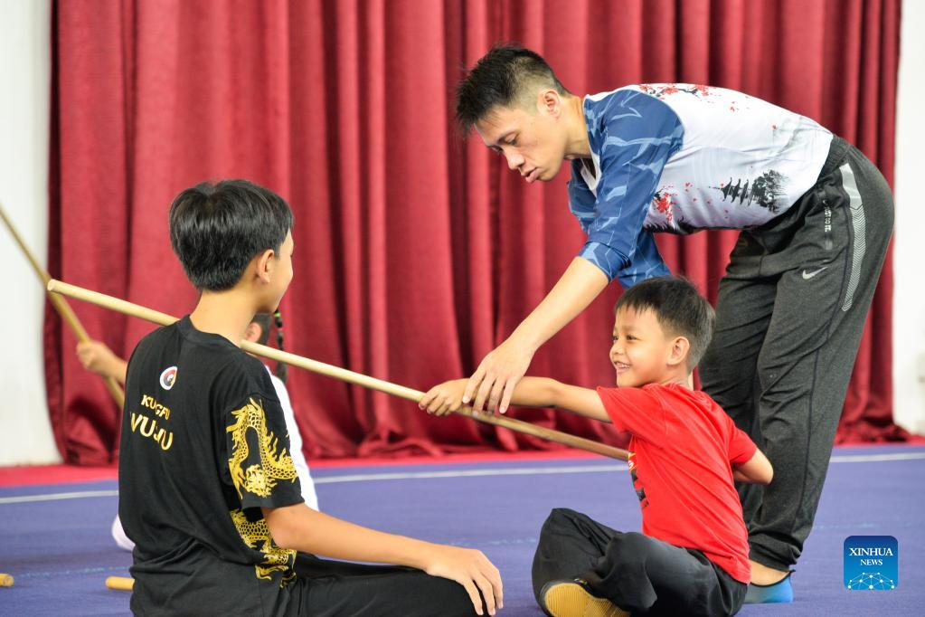 Gogi Nebulana (R), founder and martial arts coach of Harmony Wushu Indonesia, teaches children to practice martial arts at Harmony Wushu Indonesia in Bogor, Indonesia, March 5, 2022. Harmony Wushu Indonesia is a Chinese martial arts hall with a history of 25 years in Bogor, Indonesia. Founded by an Indonesian, Harmony Wushu Indonesia attracts children of different ages around the city to come here and to practice martial arts, keep fit and cultivate interest. (Xinhua/Xu Qin)