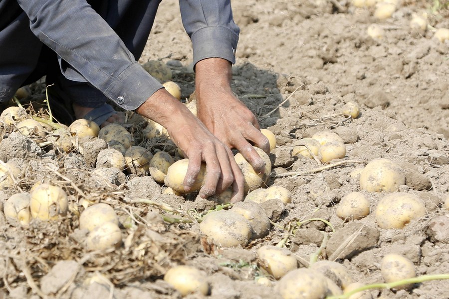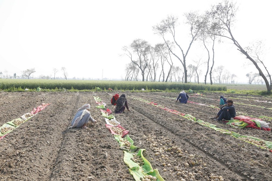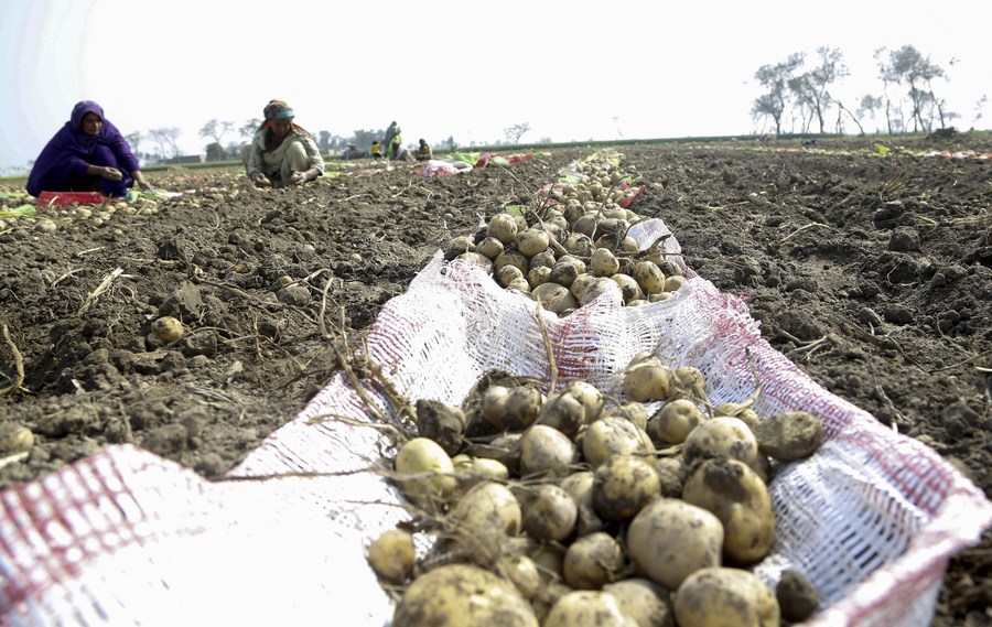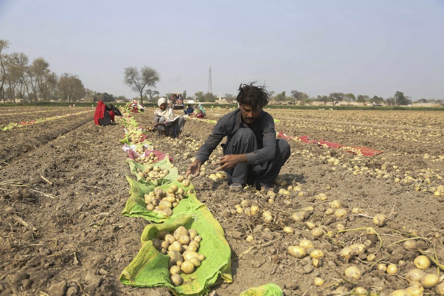 Farmers harvest potatoes in a field on the outskirts of Pakpattan, Punjab province, Pakistan, on March 4, 2022. (Xinhua/Ahmad Kamal)