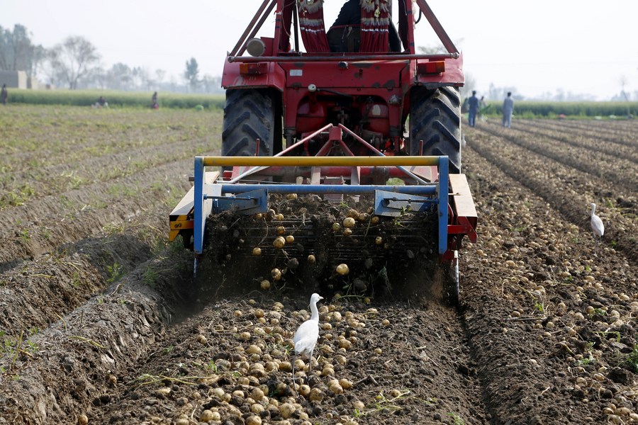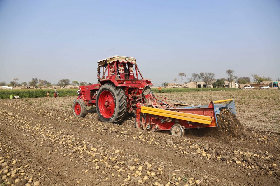 A tractor works to harvest potatoes in a field on the outskirts of Pakpattan, Punjab province, Pakistan, on March 4, 2022. (Xinhua/Ahmad Kamal)