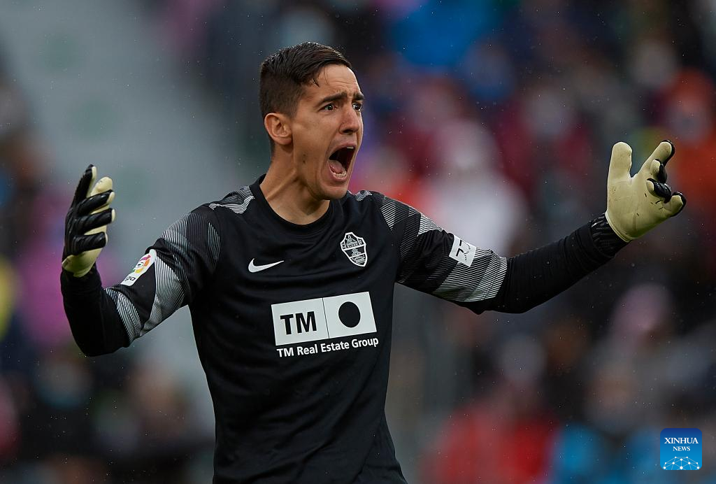 Elche's goalie Edgar Badia reacts during the La Liga match between Elche and FC Barcelona at Martinez Valero stadium in Elche, Spain, March 6, 2022. (Str/Xinhua)