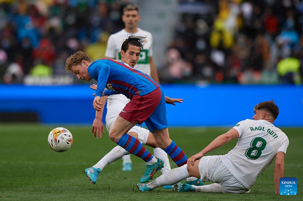 Barcelona's Frankie de Jong (L) breaks through during the La Liga match between Elche and FC Barcelona at Martinez Valero stadium in Elche, Spain, March 6, 2022. (Str/Xinhua)