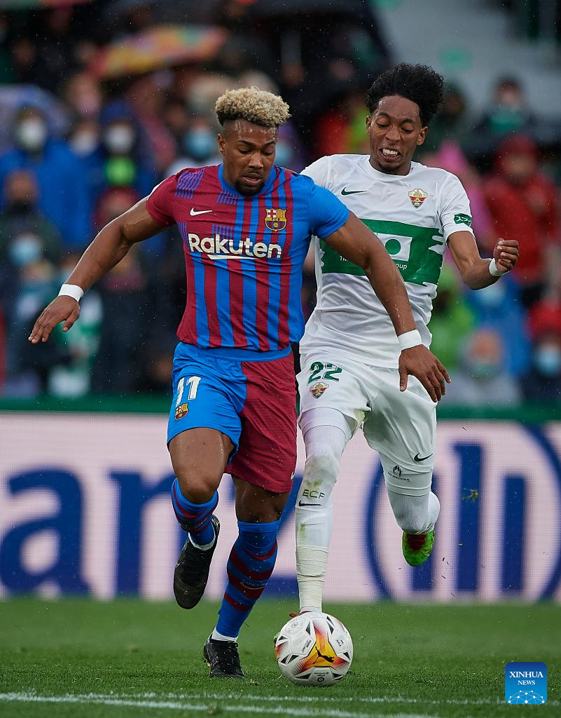 Elche's Kike Perez (R) vies with Barcelona's Adama Traore during the La Liga match between Elche and FC Barcelona at Martinez Valero stadium in Elche, Spain, March 6, 2022. (Str/Xinhua)