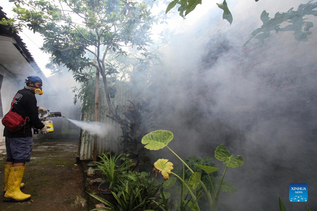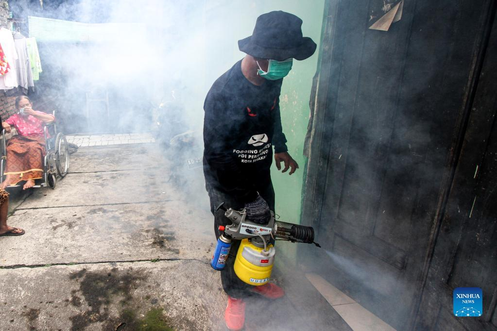 A worker sprays anti-mosquito fog to prevent the spread of dengue fever at a residential area in Surakarta, Central Java, Indonesia, March 10, 2022. (Photo by Bram Selo/Xinhua)