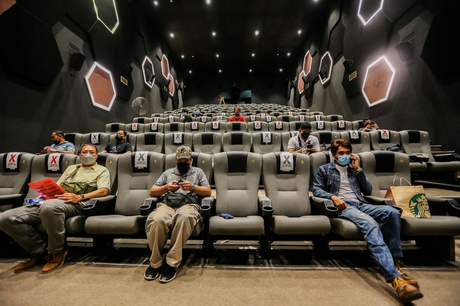 People wait to get inoculated with COVID-19 vaccine at a cinema which was turned into a vaccination area inside a mall in Pasay City, the Philippines, Dec. 16, 2021. (Xinhua/Rouelle Umali)