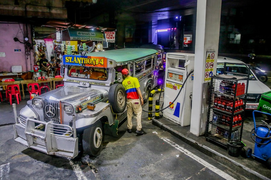 A worker refuels a jeepney at midnight in Quezon City, the Philippines, March 7, 2022. (Xinhua/Rouelle Umali)