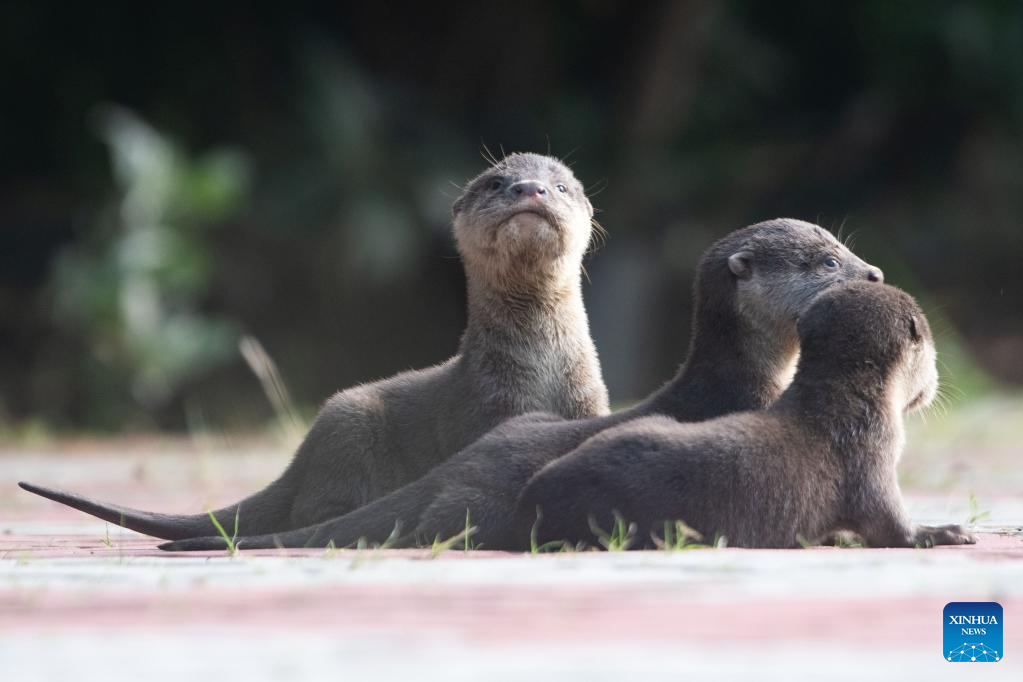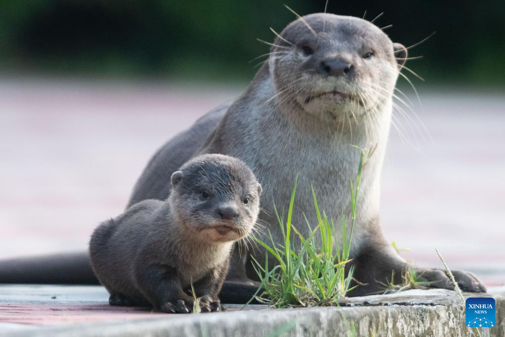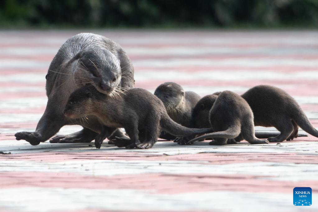 Wild smooth-coated otter pups of the Bishan family are seen in Singapore's Kallang Basin, March 15, 2022. (Photo by Then Chih Wey/Xinhua)