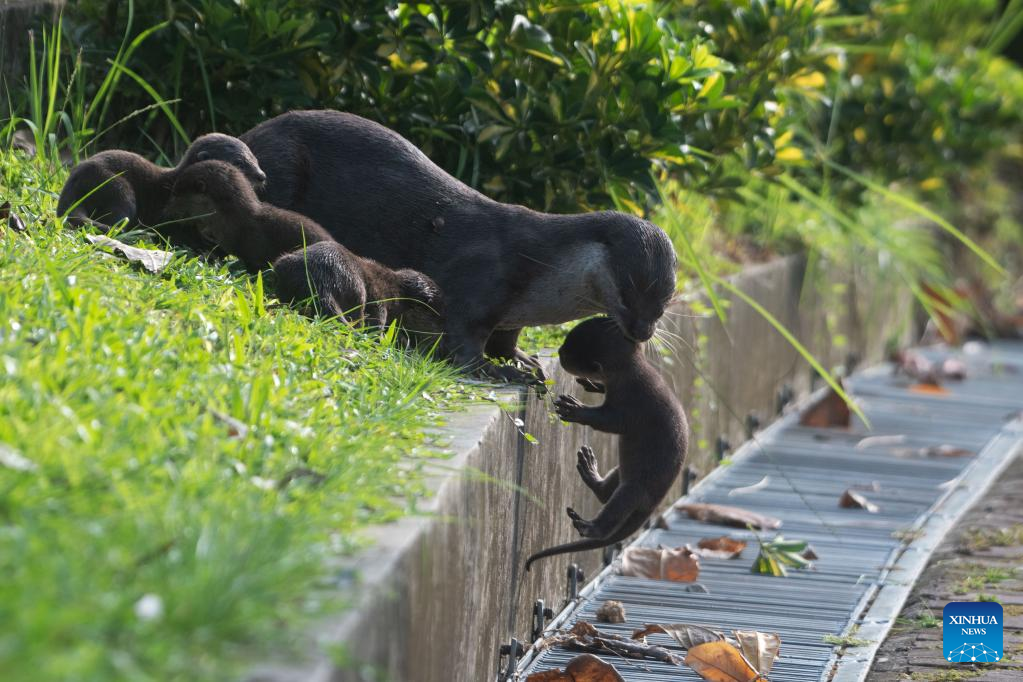 Wild smooth-coated otters of the Bishan family are seen in Singapore's Kallang Basin, March 15, 2022. (Photo by Then Chih Wey/Xinhua)