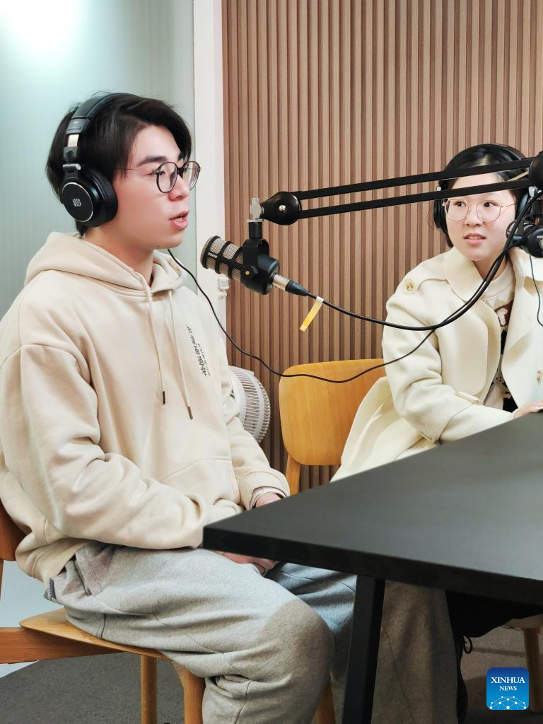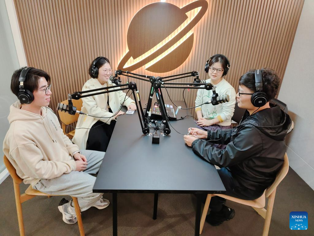 Podcasters record podcasts at a recording studio in Shanghai, east China, Feb. 22, 2022. (Xinhua)