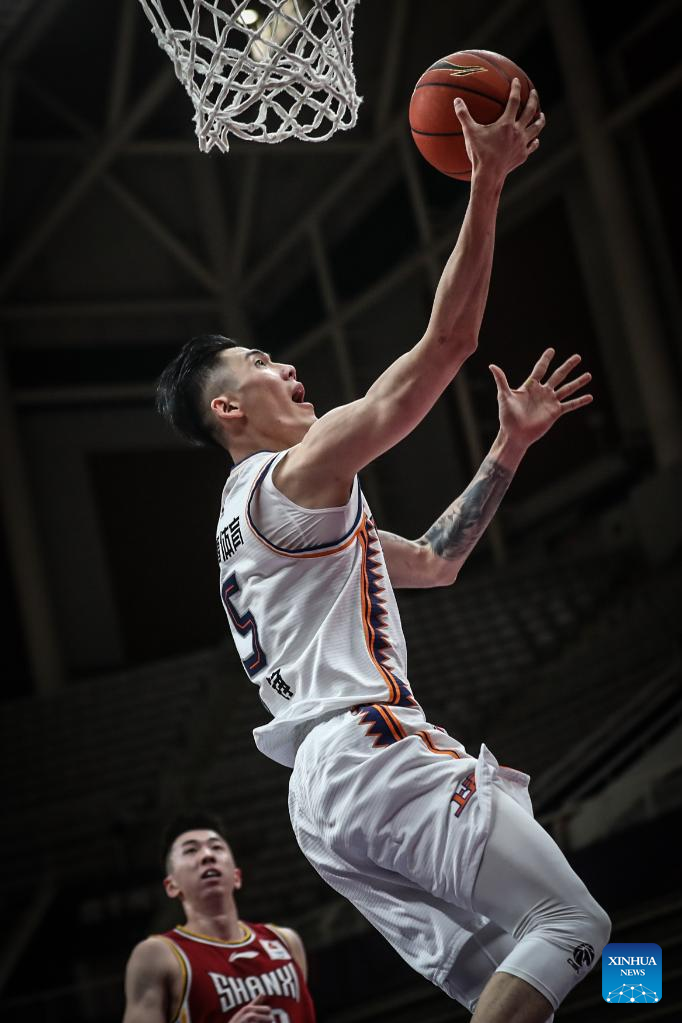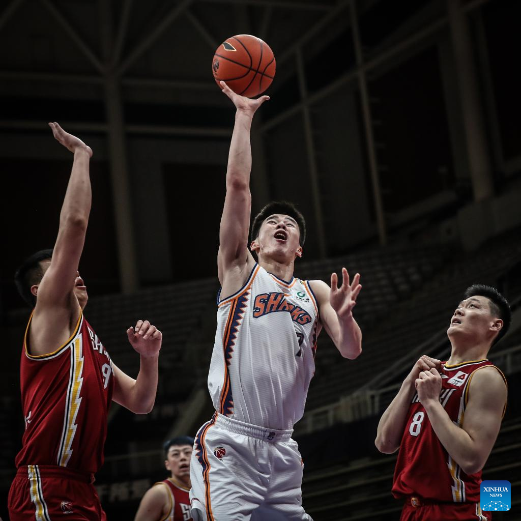 Guo Haowen (C) of Shanghai Sharks goes for the basket during the 35th round match between Shanghai Sharks and Shanxi Loongs at the 2021-2022 season of the Chinese Basketball Association (CBA) league in Shenyang of northeast China's Liaoning Province, March 16, 2022. (Xinhua/Pan Yulong)