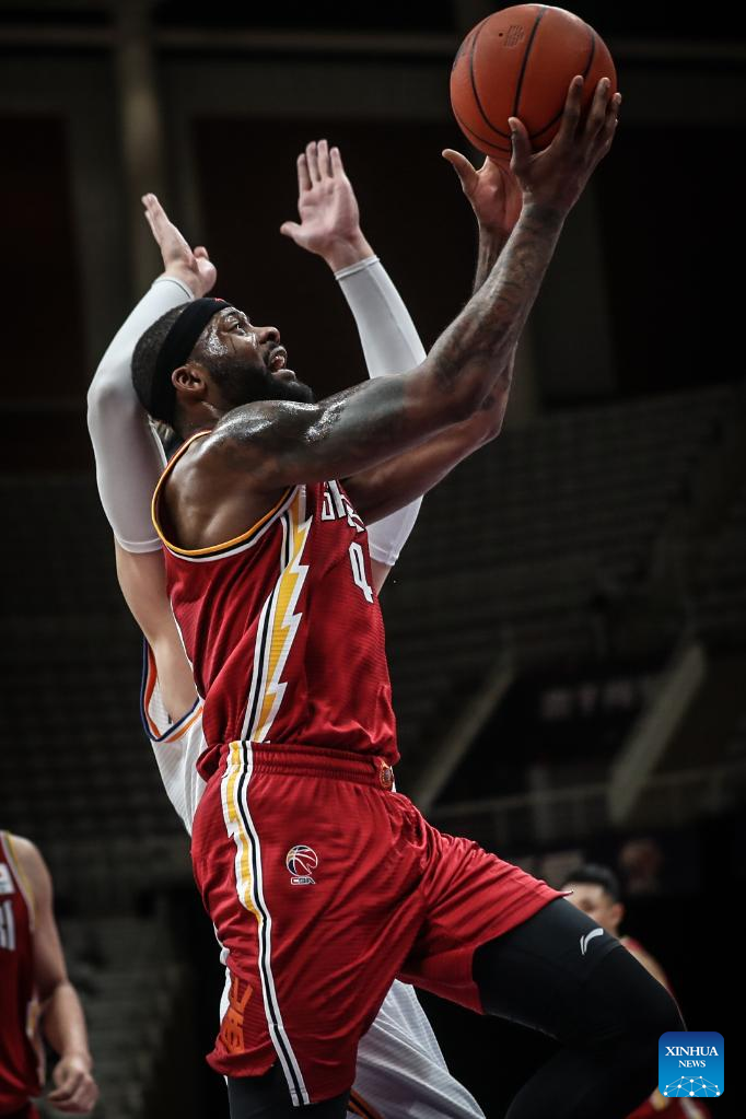 Jonathon Simmons (front) of Shanxi Loongs goes for the basket during the 35th round match between Shanghai Sharks and Shanxi Loongs at the 2021-2022 season of the Chinese Basketball Association (CBA) league in Shenyang of northeast China's Liaoning Province, March 16, 2022. (Xinhua/Pan Yulong)