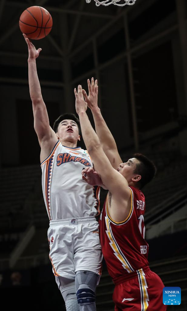 Wang Zhelin (R) of Shanghai Sharks competes during the 35th round match between Shanghai Sharks and Shanxi Loongs at the 2021-2022 season of the Chinese Basketball Association (CBA) league in Shenyang of northeast China's Liaoning Province, March 16, 2022. (Xinhua/Pan Yulong)