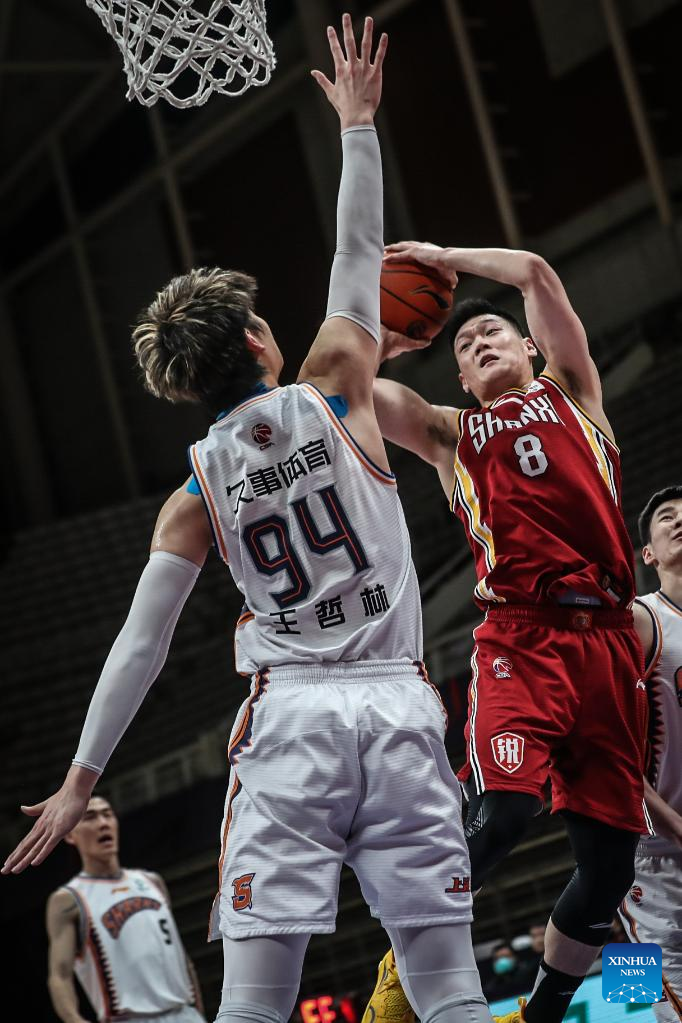 Zhang Ning (R) of Shanxi Loongs is defended by Wang Zhelin of Shanghai Sharks during their 35th round match at the 2021-2022 season of the Chinese Basketball Association (CBA) league in Shenyang of northeast China's Liaoning Province, March 16, 2022. (Xinhua/Pan Yulong)
