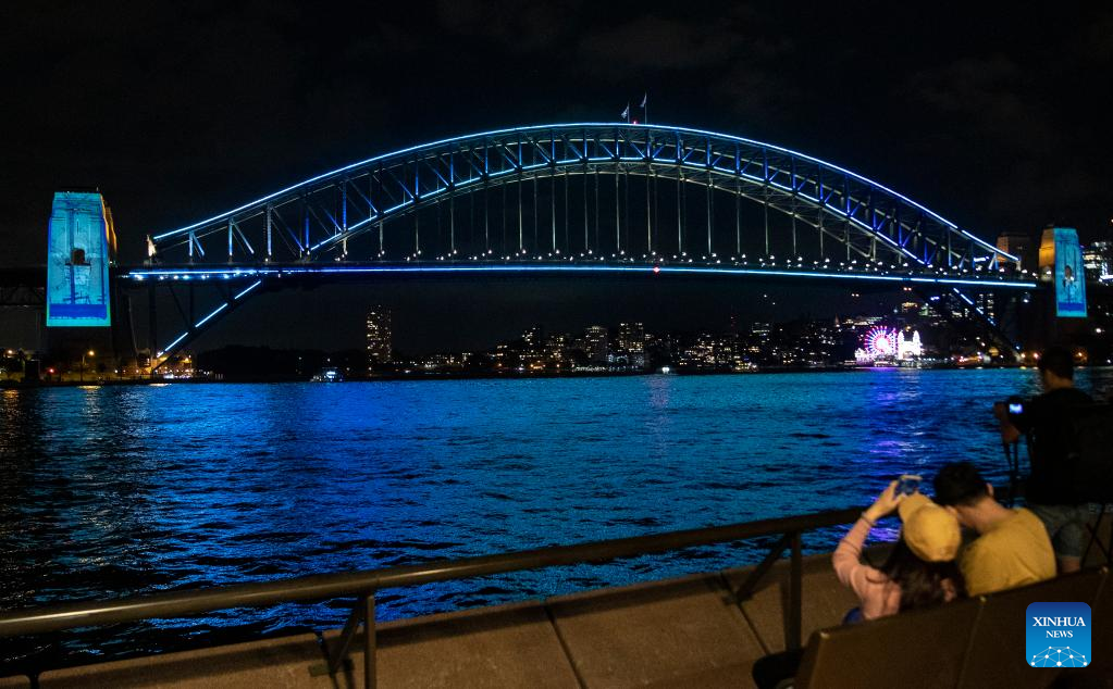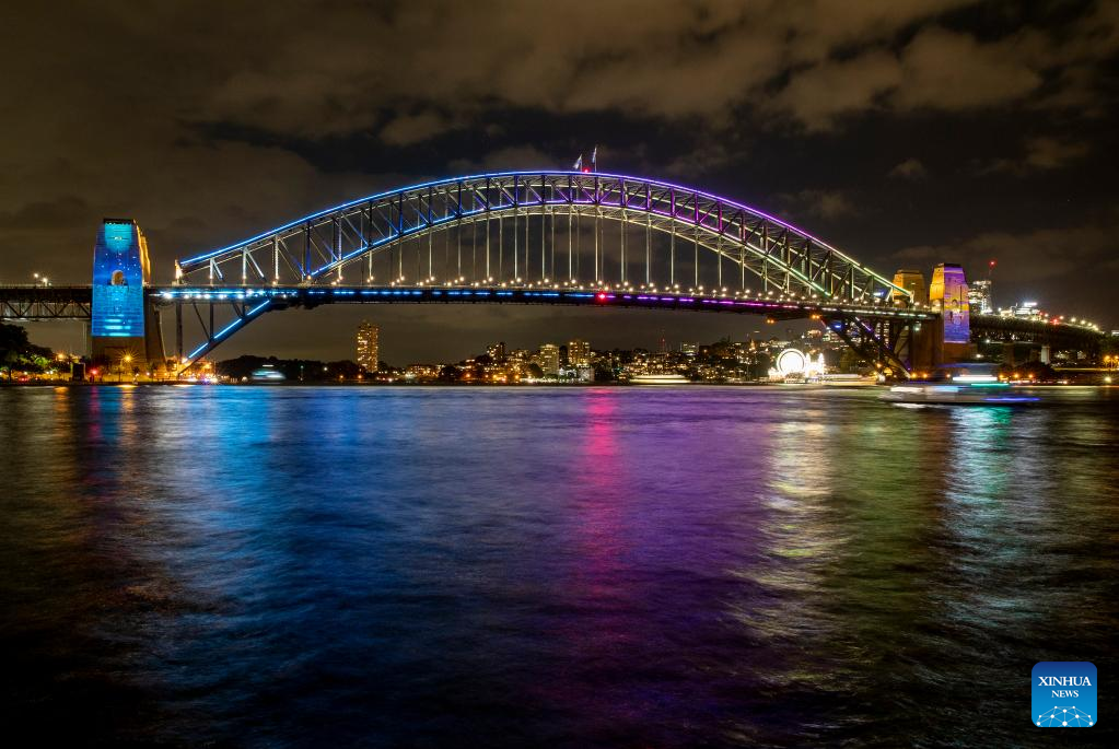 Photo taken on March 18, 2022 shows vivid light on Harbour Bridge in Sydney, Australia, as part of the Sydney Harbour Bridge 90th anniversary celebration. To mark the 90th year since the completion of Sydney Harbour Bridge, Sydneysiders headed into the harbour on Saturday to pay homage to the bridge that has connected and inspired generations of Australians. (Xinhua/Bai Xuefei)
