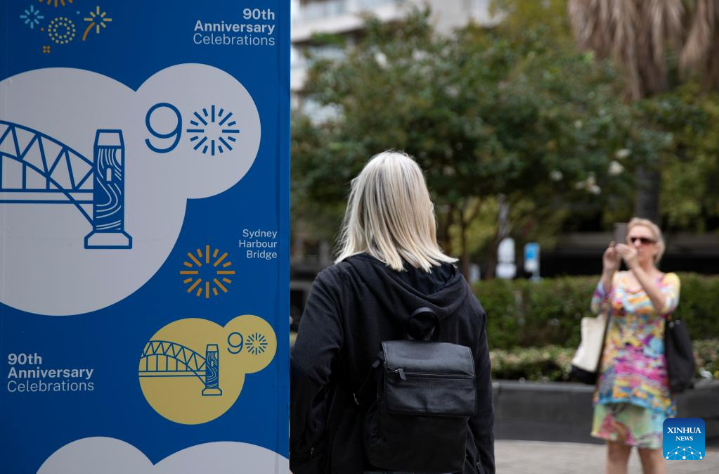 A woman takes photos near Harbour Bridge in Sydney, Australia, on March 19, 2022. To mark the 90th year since the completion of Sydney Harbour Bridge, Sydneysiders headed into the harbour on Saturday to pay homage to the bridge that has connected and inspired generations of Australians. (Xinhua/Bai Xuefei)