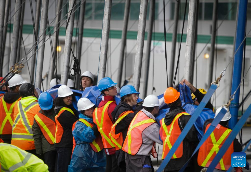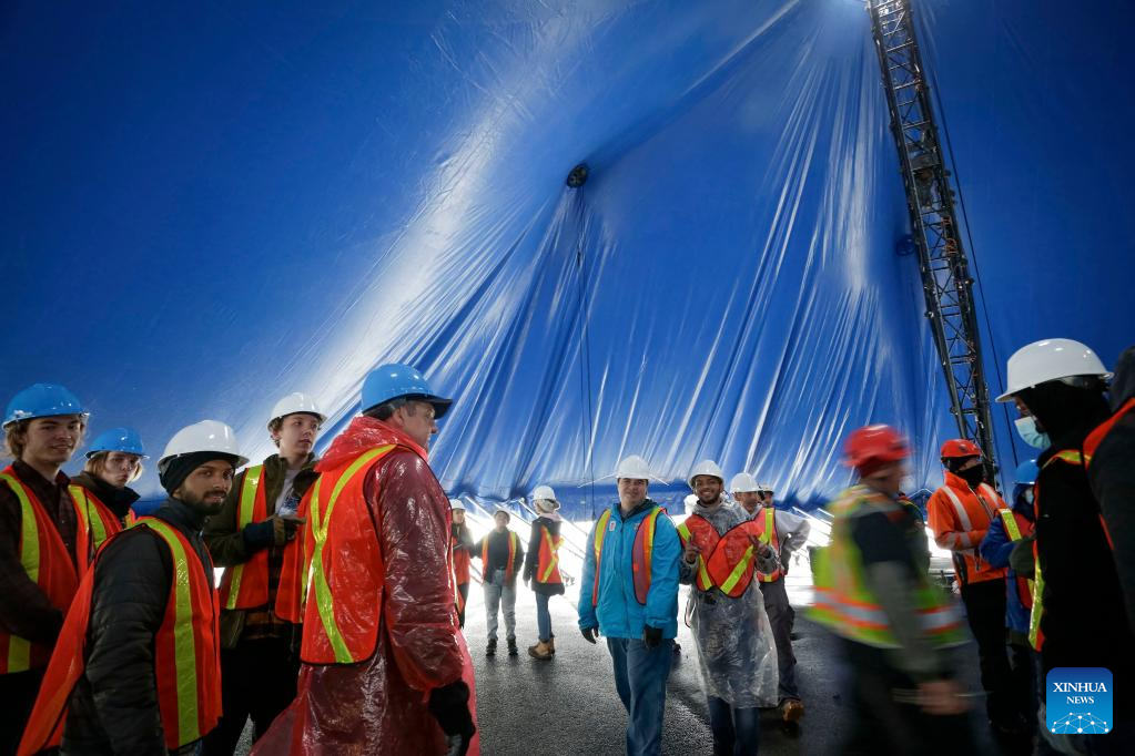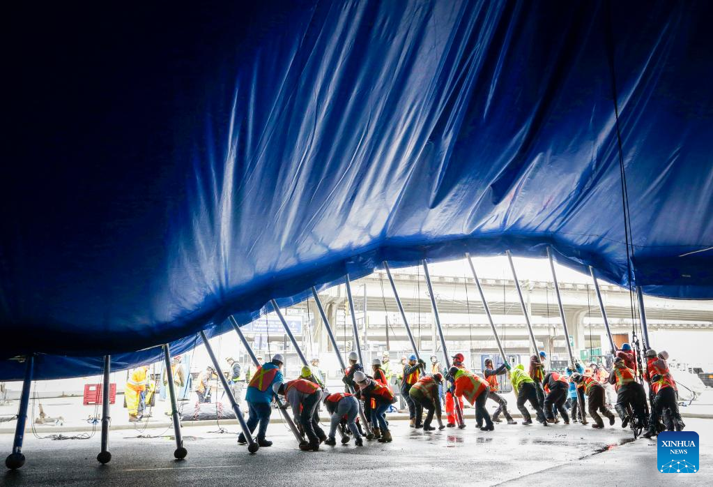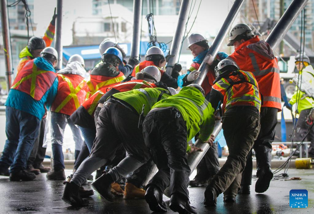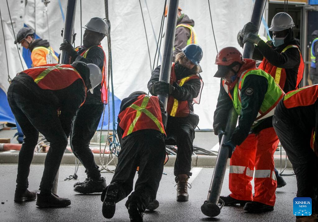 Workers push the supporting poles to raise the big top to its final position for the Cirque du Soleil's upcoming show "Alegria" at Concord Pacific Place in Vancouver, British Columbia, Canada, on March 18, 2022. More than 60 workers pushed over 100 supporting poles to raise the canvas into its final position in order to set up the the iconic Big Top - where the main stage of Cirque du Soleil will take place. (Photo by Liang Sen/Xinhua)