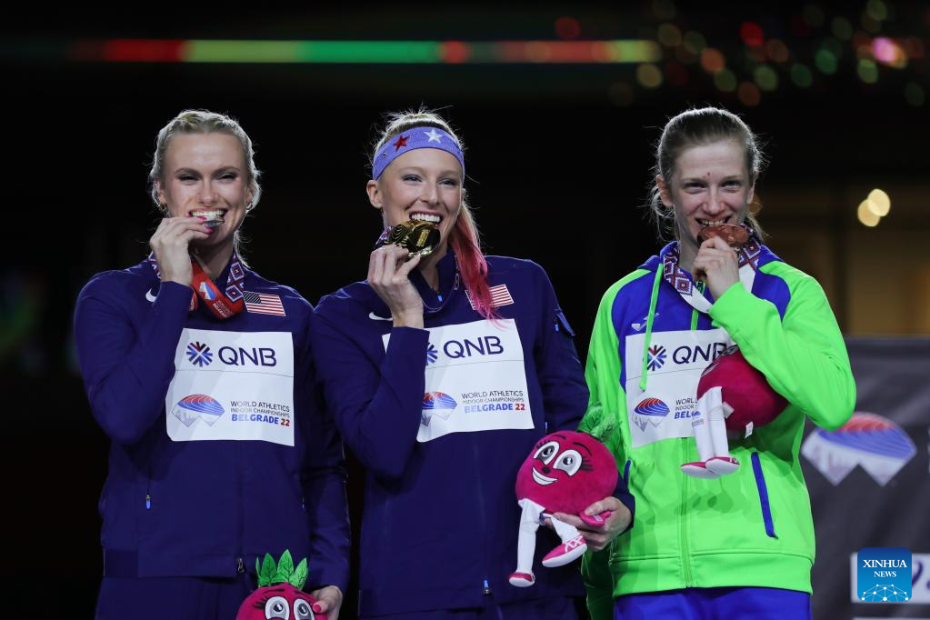 Second-placed Katie Nageotte (L) of the United States, first-placed Sandi Morris (C) of the United States and third-placed Tina Sutej of Slovenia celebrate during the awarding ceremony for the women's pole vault event at the World Athletics Indoor Championships Belgrade 2022 in Stark Arena, Belgrade, Serbia, March 19, 2022. (Xinhua/Zheng Huansong)