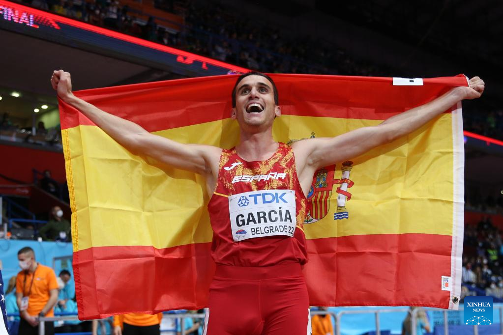Spain's Mariano Garcia celebrates after winning the men's 800m final at the World Athletics Indoor Championships Belgrade 2022 in Stark Arena, Belgrade, Serbia, March 19, 2022. (Xinhua/Zheng Huansong)