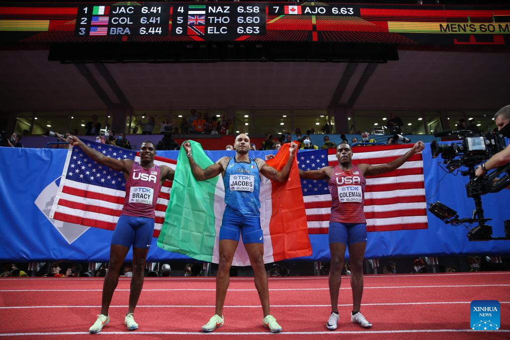 Gold medalist Lamont Marcell Jacobs (C) of Italy, silver medalist Christian Coleman (R) of the United States and bronze medalist Marvin Bracy of the United States, pose after the men's 60m final at the World Athletics Indoor Championships Belgrade 2022 in Stark Arena, Belgrade, Serbia, March 19, 2022. (Xinhua/Zheng Huansong)