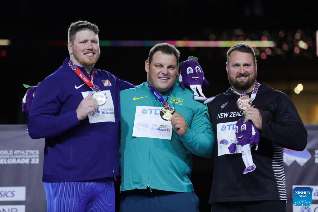 First-placed Darlan Romani (C) of Brazil, second-placed Ryan Crouser (L) of the United States and third-placed Tomas Walsh of New Zealand pose during the awarding ceremony for the men's shot put event at the World Athletics Indoor Championships Belgrade 2022 in Stark Arena, Belgrade, Serbia, March 19, 2022. (Xinhua/Zheng Huansong)