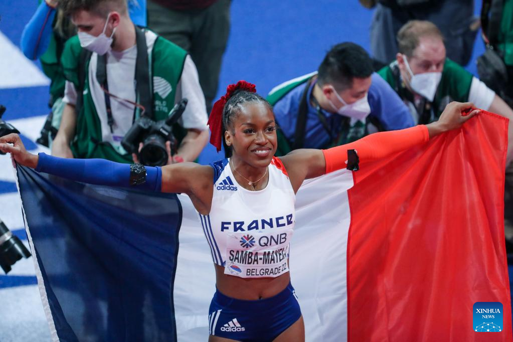 First-placed Cyrena Samba-Mayela of France celebrates after winning the women's 60m hurdles final at the World Athletics Indoor Championships Belgrade 2022 in Stark Arena, Belgrade, Serbia, March 19, 2022. (Xinhua/Shi Zhongyu)