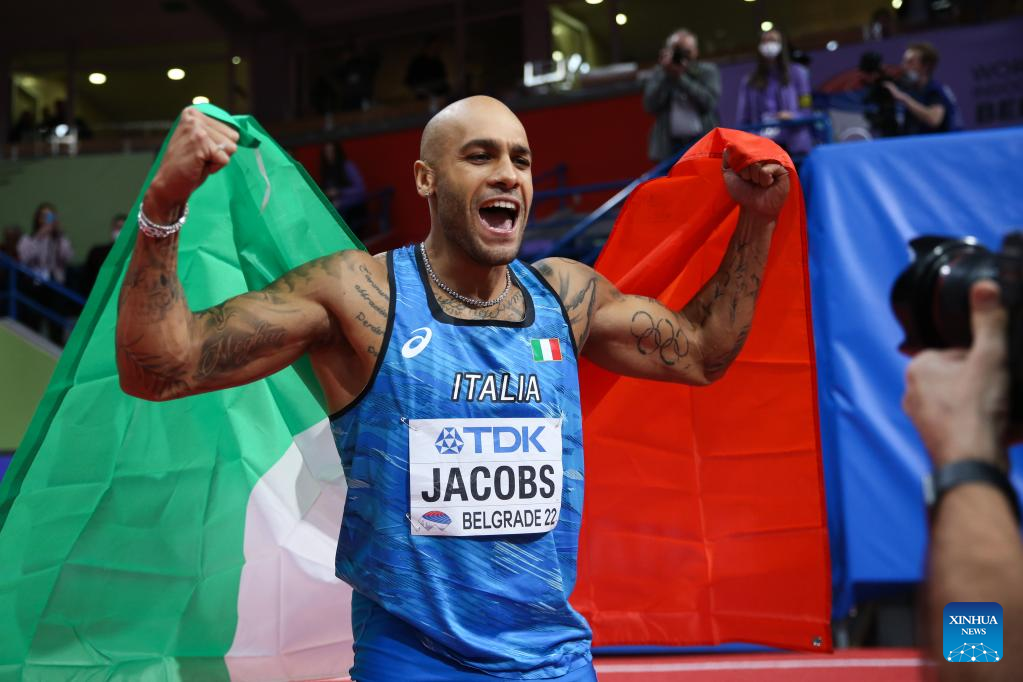 Lamont Marcell Jacobs of Italy celebrates after the men's 60m final at the World Athletics Indoor Championships Belgrade 2022 in Stark Arena, Belgrade, Serbia, March 19, 2022. (Xinhua/Zheng Huansong)