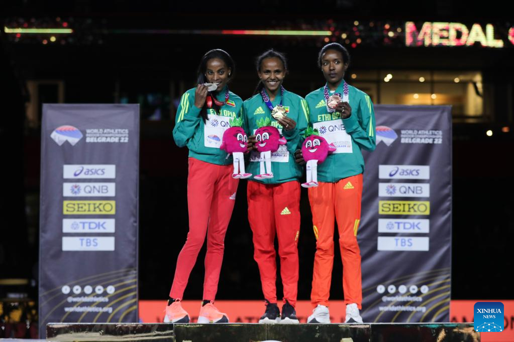 First-placed Gudaf Tsegay (C), second-placed Axumawit Embaye (L) and third-placed Hirut Meshesha of Ethiopia pose during the awarding ceremony for the women's 1500m event at the World Athletics Indoor Championships Belgrade 2022 in Stark Arena, Belgrade, Serbia, March 19, 2022. (Xinhua/Zheng Huansong)