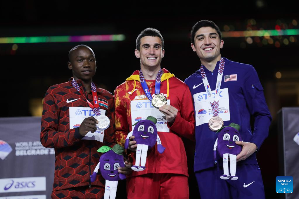 First-placed Spain's Mariano Garcia (C), second-placed Kenya's Noah Kibet (L) and third-placed Bryce Hoppel of the United States pose during the awarding ceremony for the men's 800m event at the World Athletics Indoor Championships Belgrade 2022 in Stark Arena, Belgrade, Serbia, March 19, 2022. (Xinhua/Zheng Huansong)
