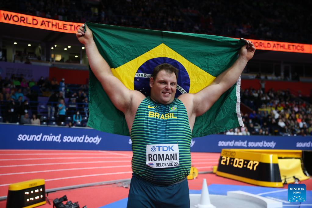 Darlan Romani of Brazil celebrates after winning the men's shot put final at the World Athletics Indoor Championships Belgrade 2022 in Stark Arena, Belgrade, Serbia, March 19, 2022. (Xinhua/Zheng Huansong)
