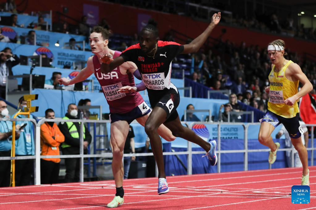 Jereem Richards (C) of Trinidad and Tobago crosses the finishing line during the men's 400m final at the World Athletics Indoor Championships Belgrade 2022 in Stark Arena, Belgrade, Serbia, March 19, 2022. (Xinhua/Zheng Huansong)