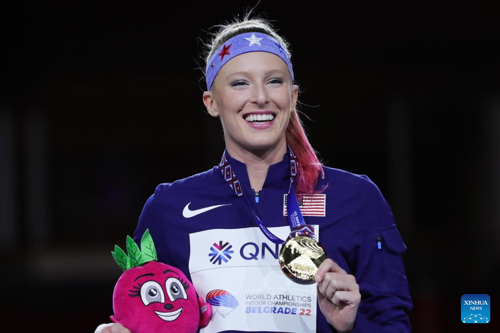 First-placed Sandi Morris of the United States celebrates during the awarding ceremony for the women's pole vault event at the World Athletics Indoor Championships Belgrade 2022 in Stark Arena, Belgrade, Serbia, March 19, 2022. (Xinhua/Zheng Huansong)