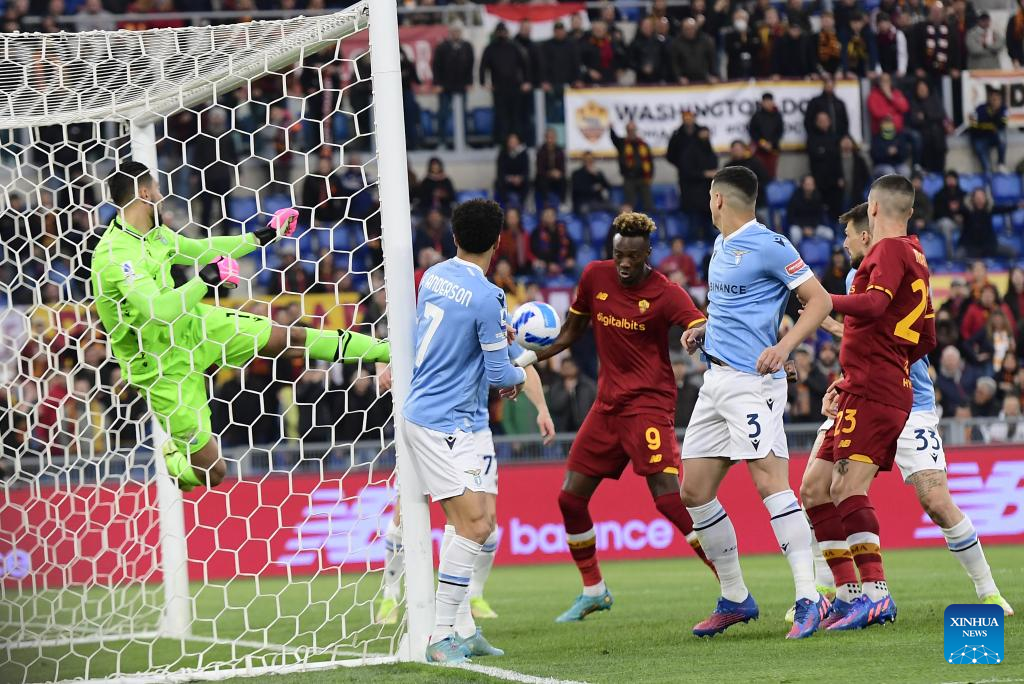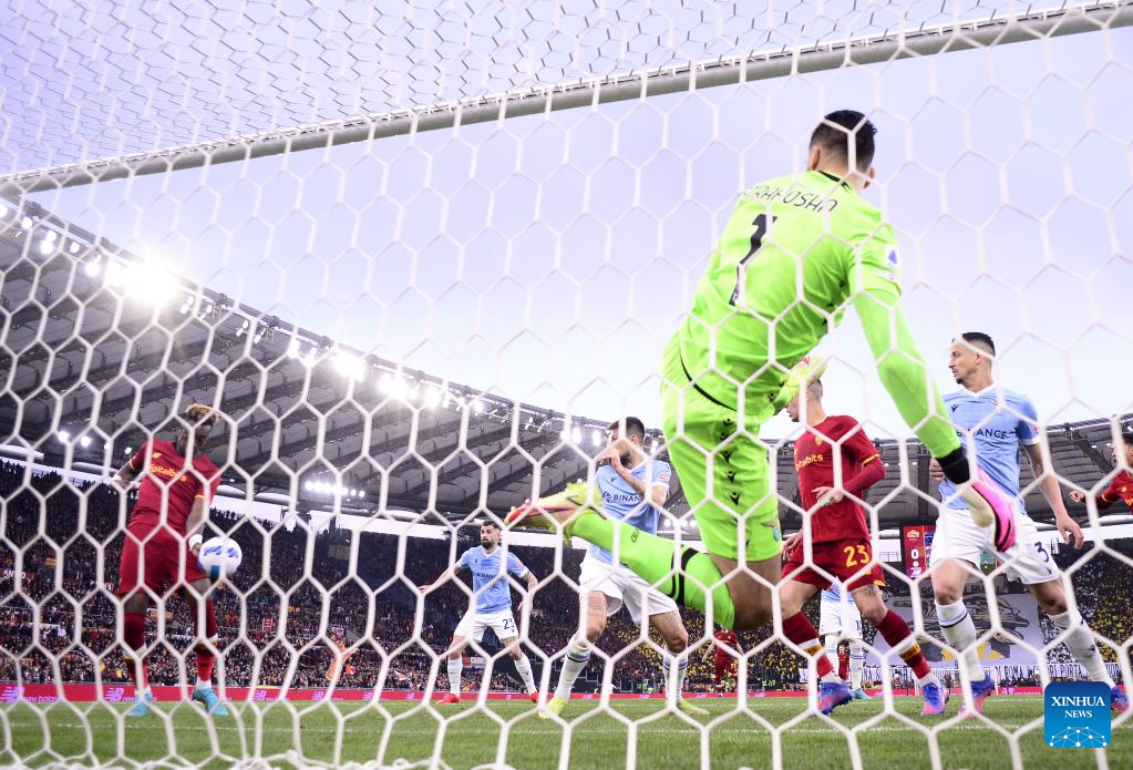 Roma's Tammy Abraham (1st L) scores during a Serie A football match between Roma and Lazio in Rome, Italy, on March 20, 2022. (Photo by Alberto Lingria/Xinhua)