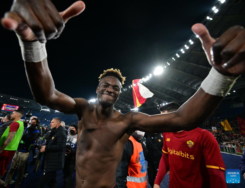 Roma's Tammy Abraham celebrates at the end of the Serie A football match between Roma and Lazio in Rome, Italy, on March 20, 2022. (Photo by Alberto Lingria/Xinhua)