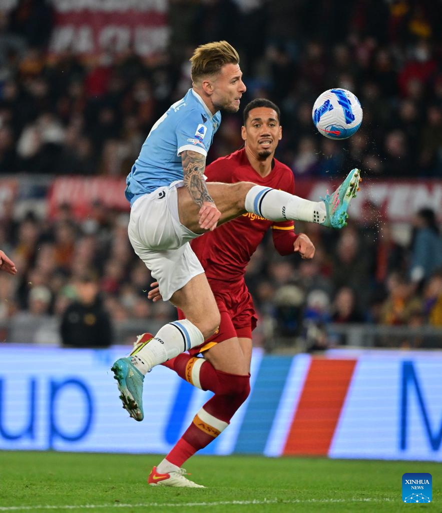 Roma's Chris Smalling (R) vies with Lazio's Ciro Immobile during a Serie A football match between Roma and Lazio in Rome, Italy, on March 20, 2022. (Photo by Alberto Lingria/Xinhua)
