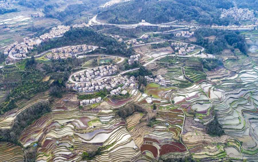 Aerial photo taken on Feb. 24, 2021 shows the scenery of Hani terraced fields in Yuanyang County of Honghe Hani and Yi Autonomous Prefecture, southwest China's Yunnan Province. (Xinhua/Chen Xinbo)