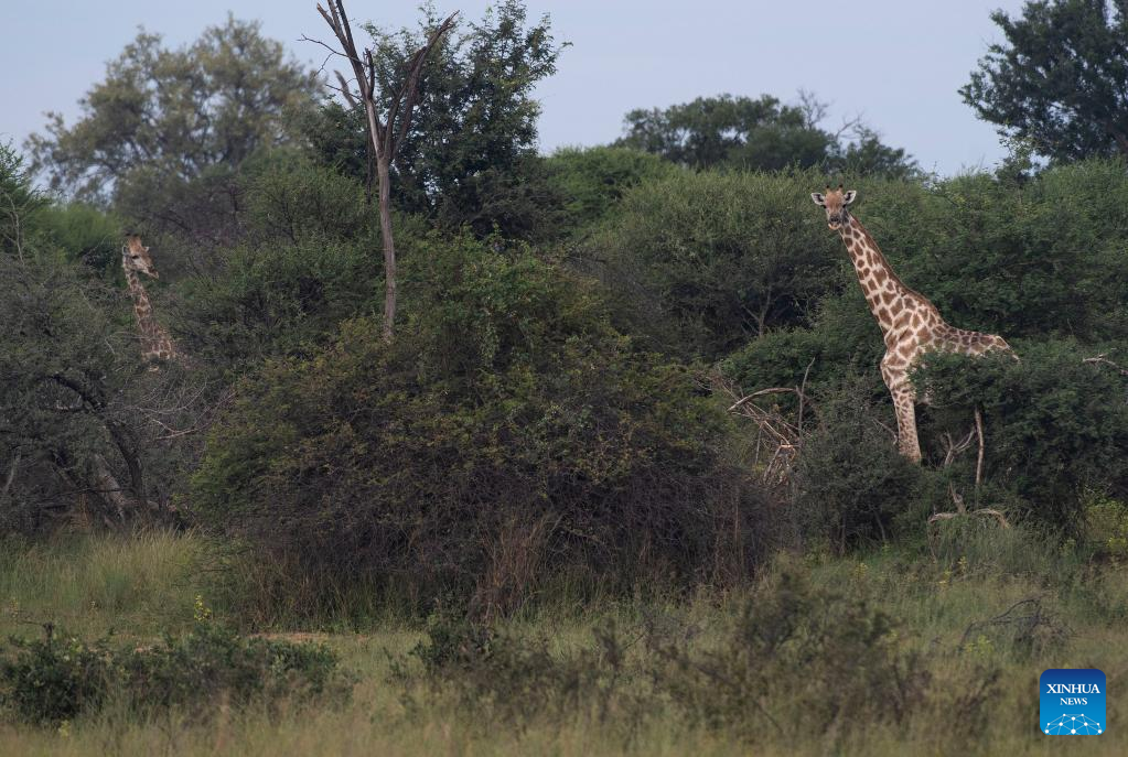 Two giraffes are seen at the Bwabwata National Park of Namibia, on March 22, 2022. (Xinhua/Chen Cheng)