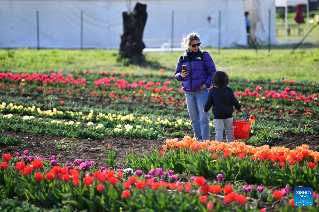 People enjoy themselves at the TuliPark in Rome, Italy, on March 22, 2022. The tulip garden with more than one hundred varieties opened to the public here on Tuesday. (Xinhua/Jin Mamengni)