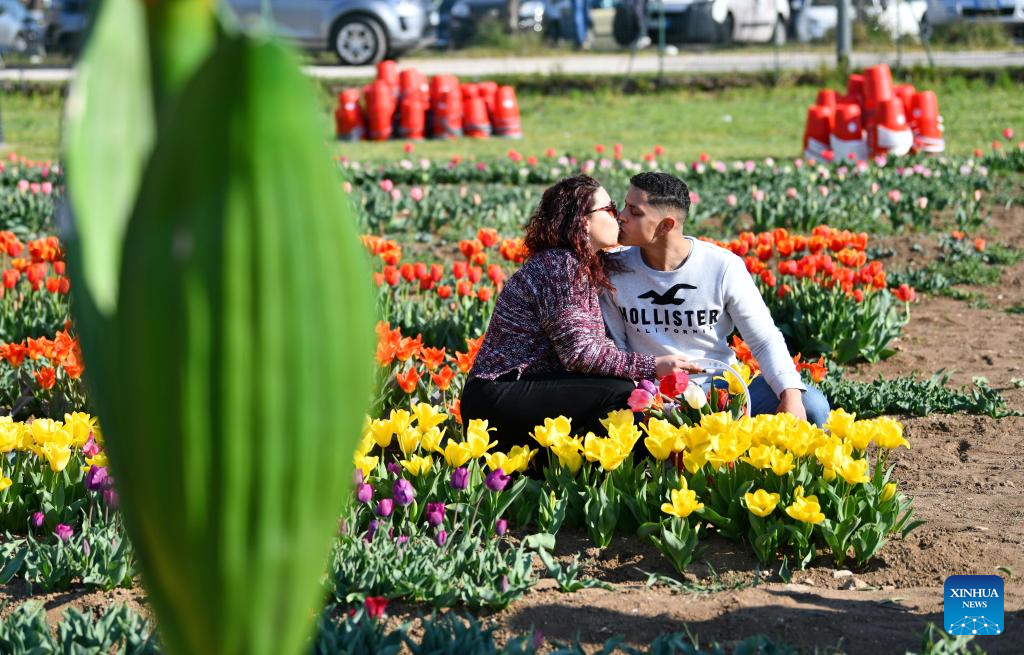 A couple poses for photos at the TuliPark in Rome, Italy, on March 22, 2022. The tulip garden with more than one hundred varieties opened to the public here on Tuesday. (Xinhua/Jin Mamengni)